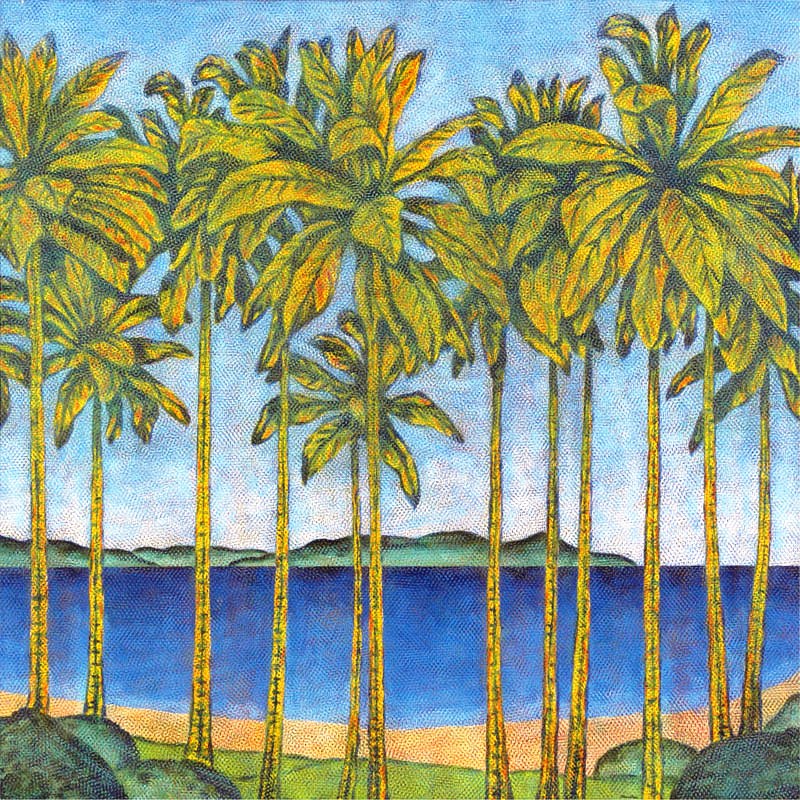 Sempre gostei desta palmeira [Bismarckia nobilis] com seus grandes “abanos” prateados que contrastam tão bem com os verdes do jardim! Esses leques naturais não passam de duas dezenas na planta madura, e sempre têm cor pálida, cinza, como prata à luz do sol. Suas folhas dão a impressão de estarem seguras pelas mãos de bailarinas invisíveis, amarradas em um único tronco, que abrem seus leques em dança delicada, sensual, à moda oriental.