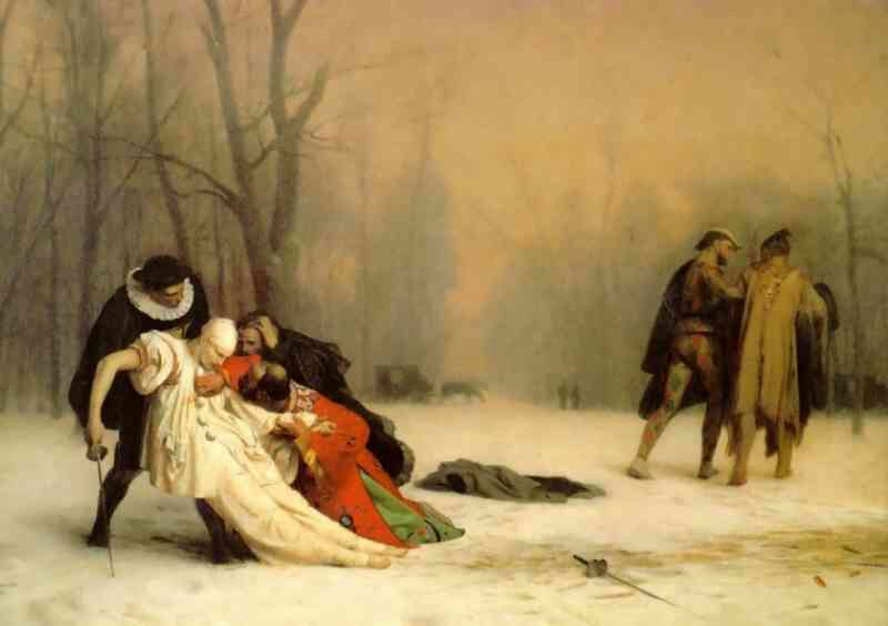 Um exemplo da carga emocional do Pierrô no século dezenove está representado no quadro de Gerôme, onde a figura de Pierrô é mostrada ferida, como consequência de um duelo pós-baile. Nada mais romântico, nada mais dilacerante para corações mal-entendidos e ingênuos. No entanto, passado os meados do século XIX, nenhum dos três personagens da Commedia dell’ Arte parece conquistar terreno na pintura. Ocasionalmente vemos um deles, mas com os movimentos artísticos do realismo ao impressionismo, deu-se menos importância ao pesado conteúdo dramático que Pierrô parecia representar. O interesse dos artistas estava em outras áreas, em grande parte fundamentadas nas questões de percepção da luz e forma, como vemos no impressionismo. Arlequim e Pierrô retornam nas últimas décadas do século. Diferentes. Suas vestimentas de cores contrastantes atraem pelo potencial à estilização. Pierrô, em geral de traje branco com pompons contrastantes, oferece a possibilidade de um ensaio sobre os tons de branco, enquanto Arlequim trajado de malha em losangos coloridos oferece um “quebra-cabeças” natural para o pintor. Não é à toa que a dupla Arlequim e Pierrô frequenta muitas telas de Cézanne em diante.