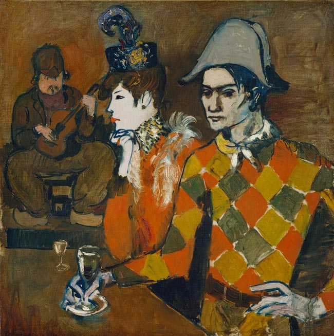 Muitos são os artistas que se dedicaram seguidamente às imagens do trio de zanni — empregados domésticos — personagens originários da Commedia dell’ Arte. Picasso é só um dentre os muitos europeus que exploraram o tema. E como não havia um roteiro específico regendo a interação desses personagens, já que eles faziam parte de companhias de teatro de improviso, cada espetáculo era diferente, com peripécias e desfechos diversos. Mas cada personagem agia sempre dentro dos limites pré-estabelecidos, que toda a platéia conhecia. Com a variação de histórias, a comédia era única à cada cidade visitada, mas Arlequim continuava sabido, Colombina namoradeira, Pierrô ingênuo. Aos poucos, do século XVI ao século XVIII, essas características se modificaram. Antoine Watteau, pintor francês, esteve entre os primeiros a representar esses personagens com uma maior carga emocional do que lhes havia sido atribuída até então.