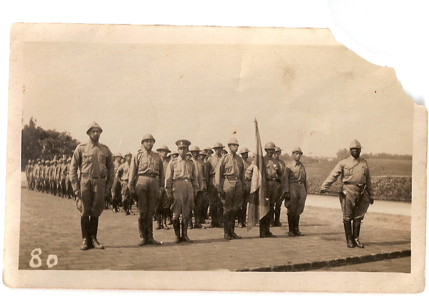 Papai mandou por um mensageiro apetrechos dos soldados prisioneiros durante um combate em Mogi-Mirim. Capacetes de aço novinhos, cinturões, cantis etc. e uma caixa de papelão que continha um pão de forma, uma lata de carne em conserva e um papel escrito em letras vermelhas: Refeição de emergência para a trincheira.