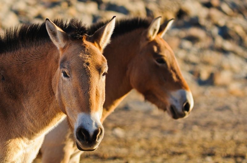 Os cavalos Przewalski, foram descritos pela primeira vez em 1881 pelo zoólogo russo Poliakov, que os nomeou para homenagear o explorador e geógrafo russo Nikola Mikhalovitch Przewalski (1839-1888) que os havia descoberto nas montanhas, quando vinha através do deserto de Gobi em 1879. Eles fazem parte da única espécie sobrevivente de cavalo selvagem. Têm a silhueta atarracada, com aproximadamente 1,20 m de altura, peso variando entre 250 a 350 kg e a pelagem marrom. São os parentes mais próximos dos cavalos pintados nas paredes das grutas do período pré-histórico e já habitaram a vastas pradarias da Ásia Central. No entanto, a partir do início de 1900, a pressão da caça, a concorrência por terras de pasto e água, e o cruzamento com pôneis Mongol contribuíram para a crescente escassez desses cavalos em seu estado natural. A proteção legal que existe desde 1926 na Mongólia provou não ter qualquer efeito. O cavalo Przewalski que retorna, hoje, às estepes mongólicas, sua terra de origem, foi salvo pelos esforços dos zoológicos.
